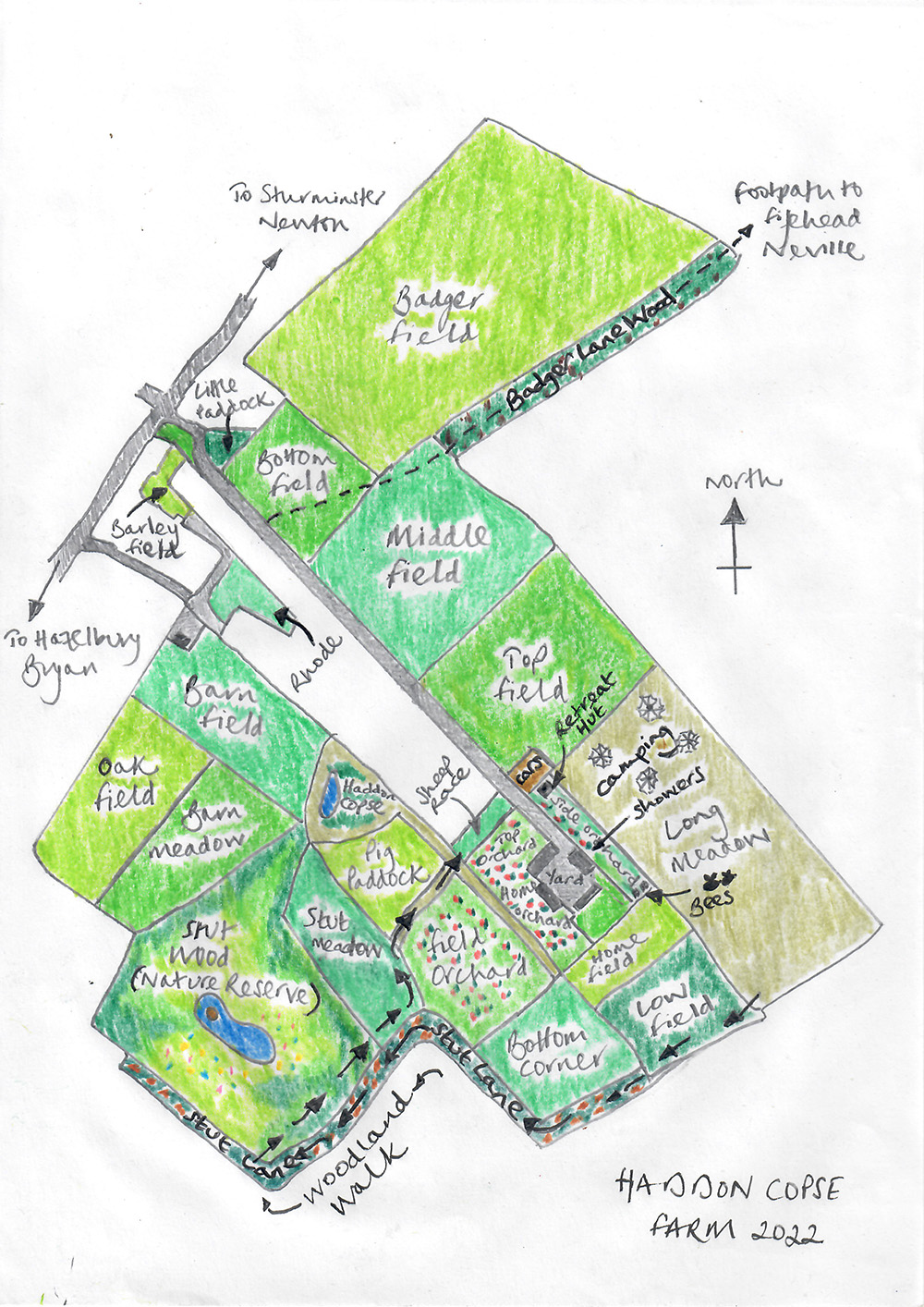 Haddon Copse Farm is situated on the Sturminster Newton to Hazelbury Bryan road – do not take the fingerpost turning to Fifehead Neville but continue for 150 yards and the farm entrance is on the left just past a row of cottages – there is a large oak sign. Turn left here and drive carefully up the track.